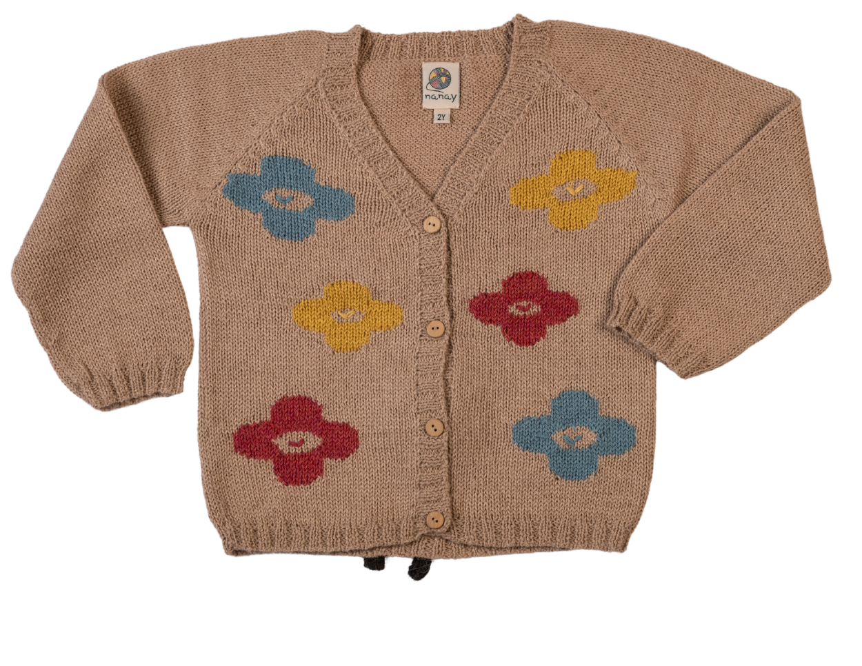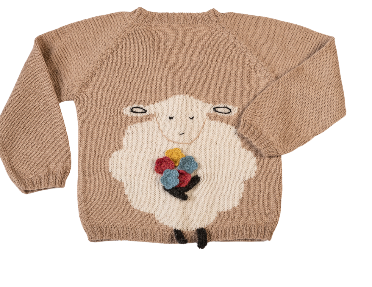 Each cardigan features adorable little lamb designs on the front and back — inspired by the playful lambs that roam the Bolivian highlands. With tiny tails and gentle details, these designs capture the innocence and joy of childhood while bringing a touch of nature’s charm to every outfit.