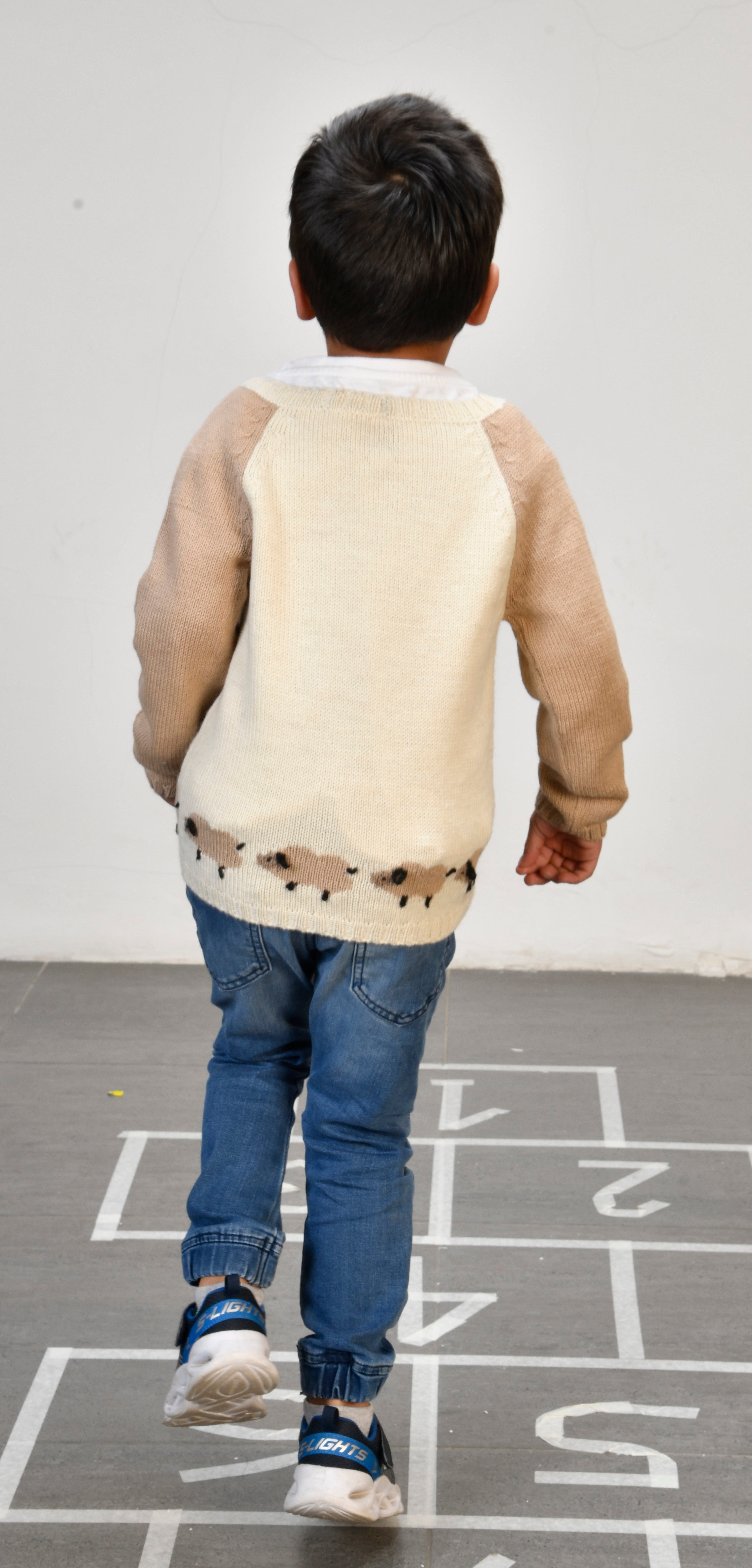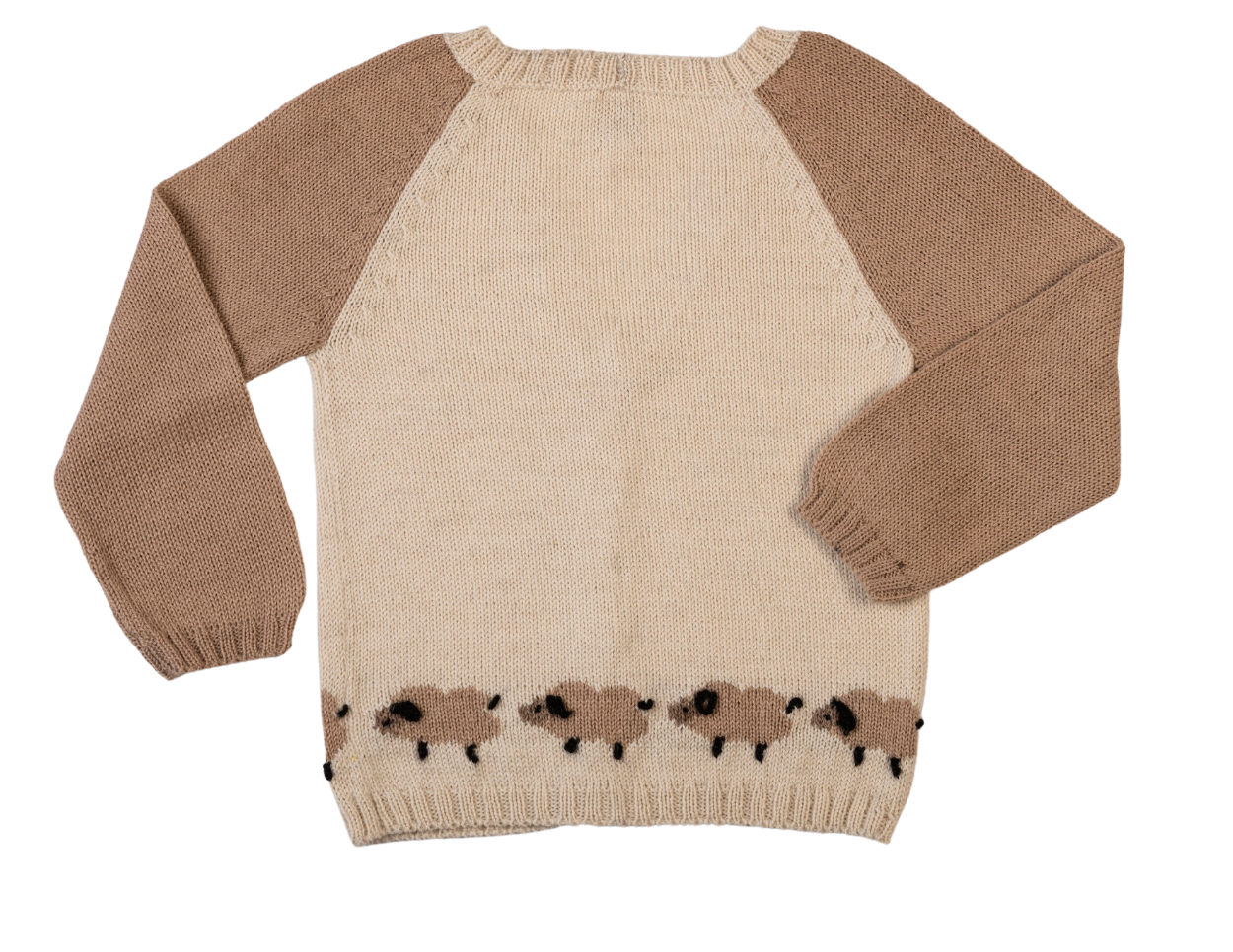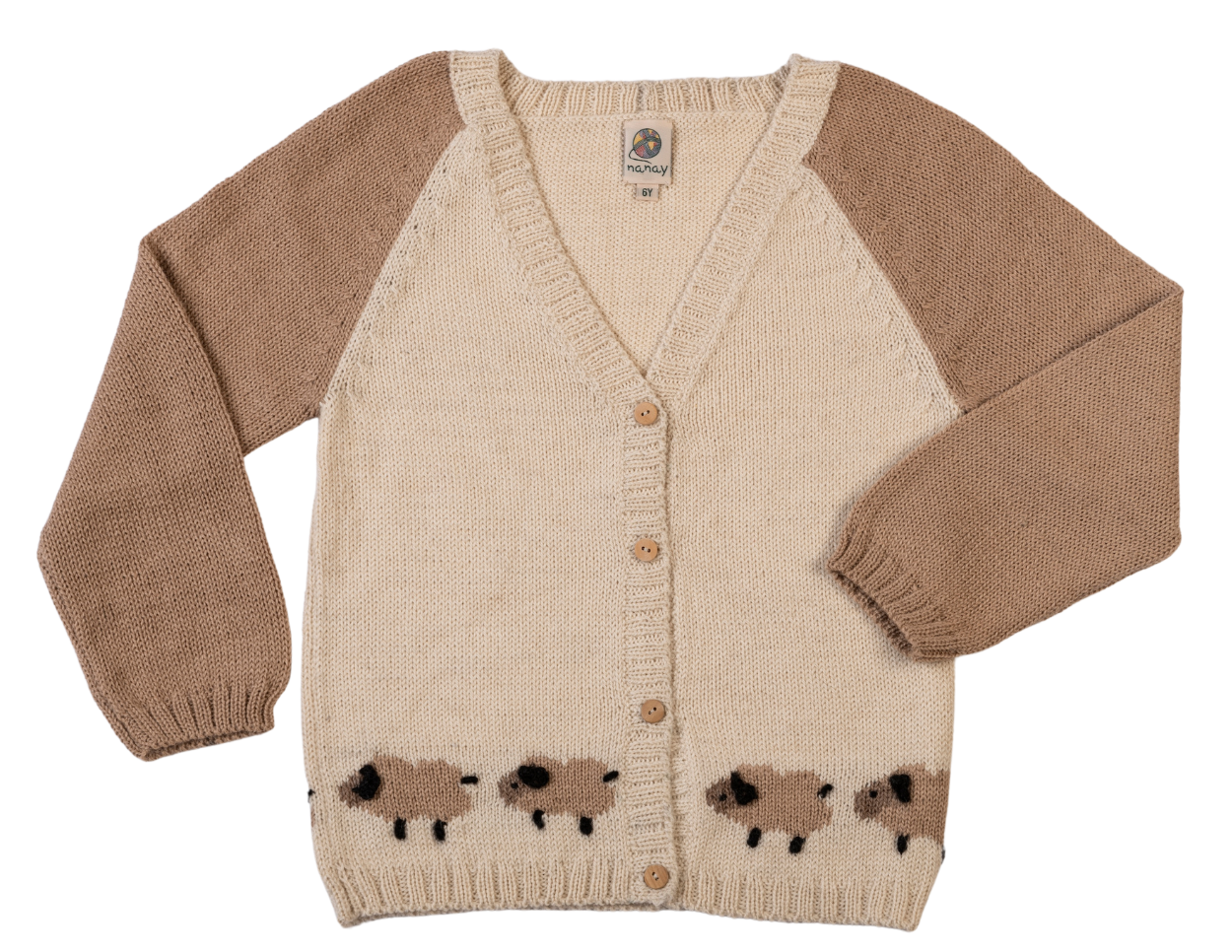 Each cardigan features adorable little lamb designs on the front and back — inspired by the playful lambs that roam the Bolivian highlands. With tiny tails and gentle details, these designs capture the innocence and joy of childhood while bringing a touch of nature’s charm to every outfit.